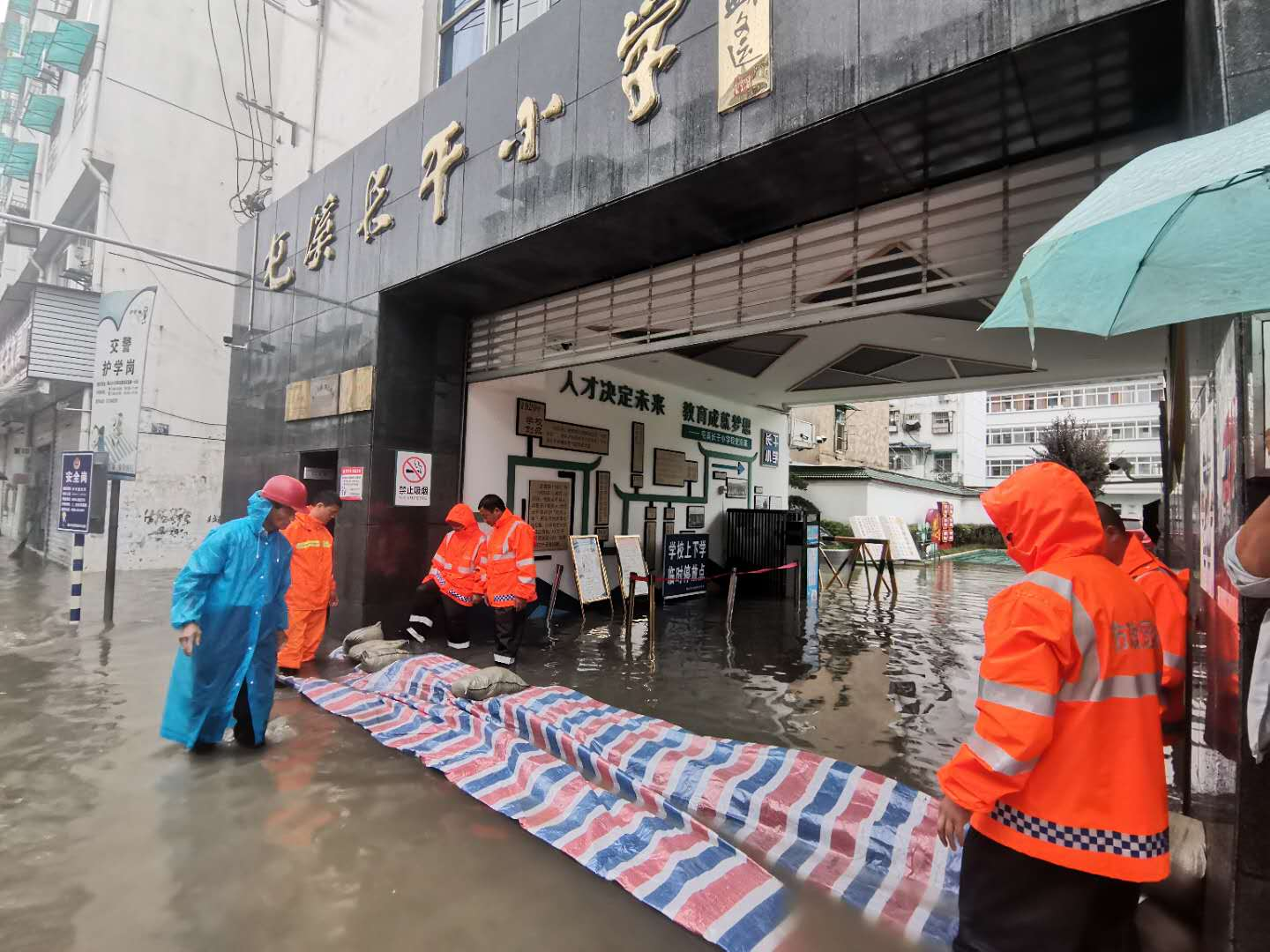 由于降雨一直在持續(xù),積水處可能有水位升高的危險(xiǎn),搶險(xiǎn)人員采取了外堵內(nèi)排的方式,首先,對(duì)校園大門處進(jìn)行了沙包圍堰,防止道路積水向校園漫灌;其次,采用汽油機(jī)作為緊急抽排水工具對(duì)校園內(nèi)的積水進(jìn)行助排;最后,對(duì)周邊道路積水處采取打開(kāi)雨水井蓋、清除雨水篦口等措施進(jìn)行人工助排。