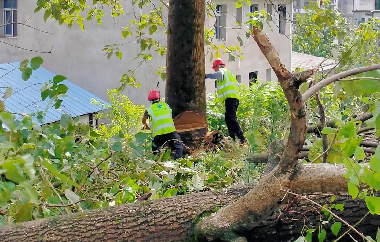 8月6日,市政園林公司派出12名城市運維人員,攜帶油鋸、折疊梯和鋼絲繩開展安全隱患排除工作。到達現場后,運維人員首先疏導周邊行人,設置施工警示標志,安全管理人員按照安全生產有關要求督導運維人員安全生產,確保施工過程安全無事故。