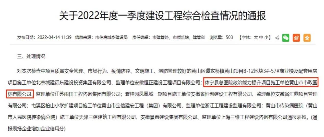 近日,市政園林公司承建的休寧縣總醫(yī)院救治能力提升項(xiàng)目在市住建局開(kāi)展的2022年度一季度建設(shè)工程綜合檢查中獲得通報(bào)表?yè)P(yáng)。