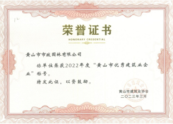 2023年3月,黃山市市政園林有限公司再次榮獲黃山市建筑業(yè)“優(yōu)秀企業(yè)”稱號(hào)。此次表彰,體現(xiàn)了政府部門(mén)、業(yè)主和監(jiān)理等各方對(duì)我公司建設(shè)質(zhì)量及管理水平的高度認(rèn)可,也是公司不斷前進(jìn)發(fā)展的根本,是公司全體員工不斷進(jìn)取,狠抓工程質(zhì)量,不斷提高管理水平的重要體現(xiàn)。